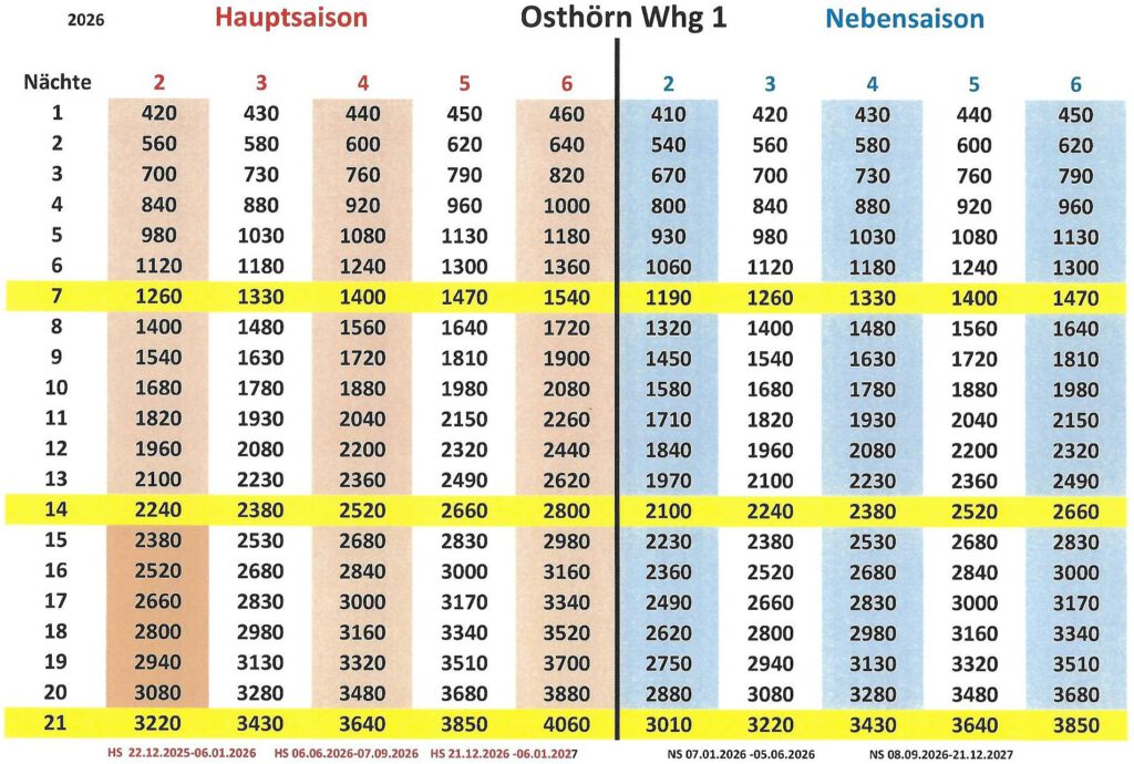 Hauptsaison: 22.12.2025 – 06.01.2026 -06.06.2026 – 07.09.2026- 21.12.2026 -06.01.2027